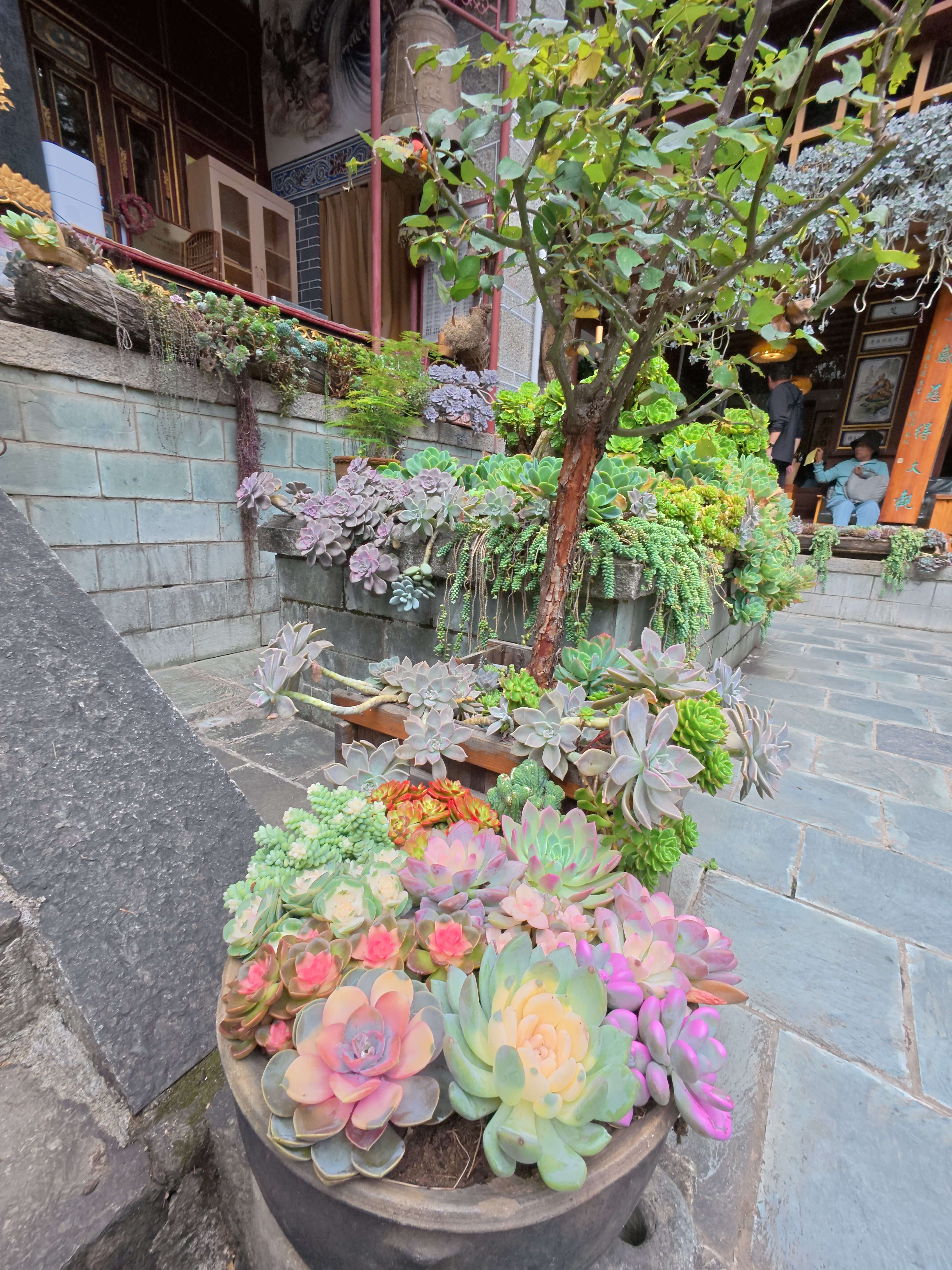 真正的目的地寂照庵还要再往上走。寂照庵并没有多大,是个小寺庙,但它“以花供佛”的理念着实有趣。先映入眼帘的是寂照庵门口路边上的几大丛绣球花,进入寺庙后能看到许多多肉植物,这些多肉长得粗壮巨大状况极好。香火炉中也不是烟雾缭绕的香火而换成了数个多肉花篮。据说院外还有月季棚,可惜当时没有去看。