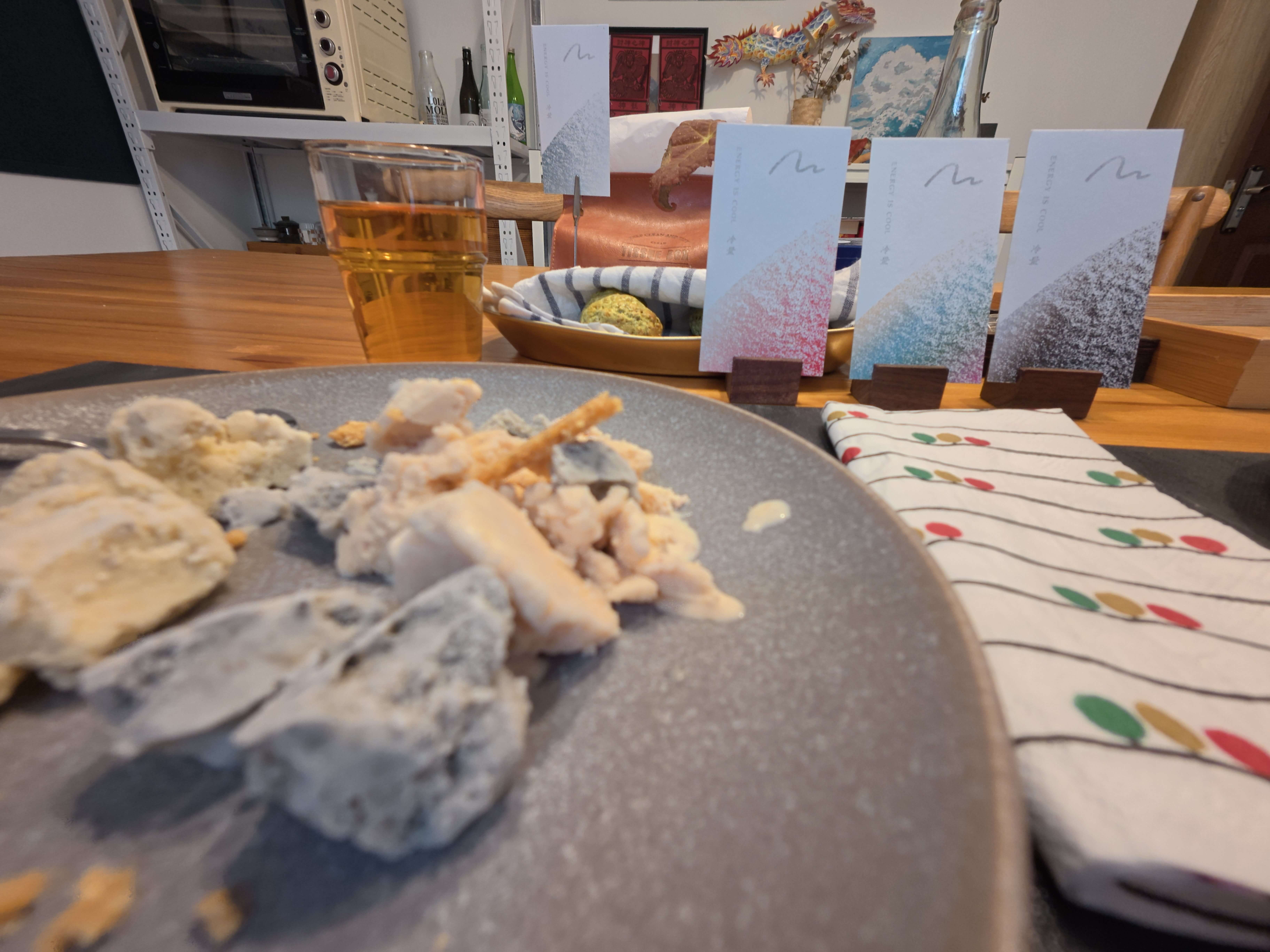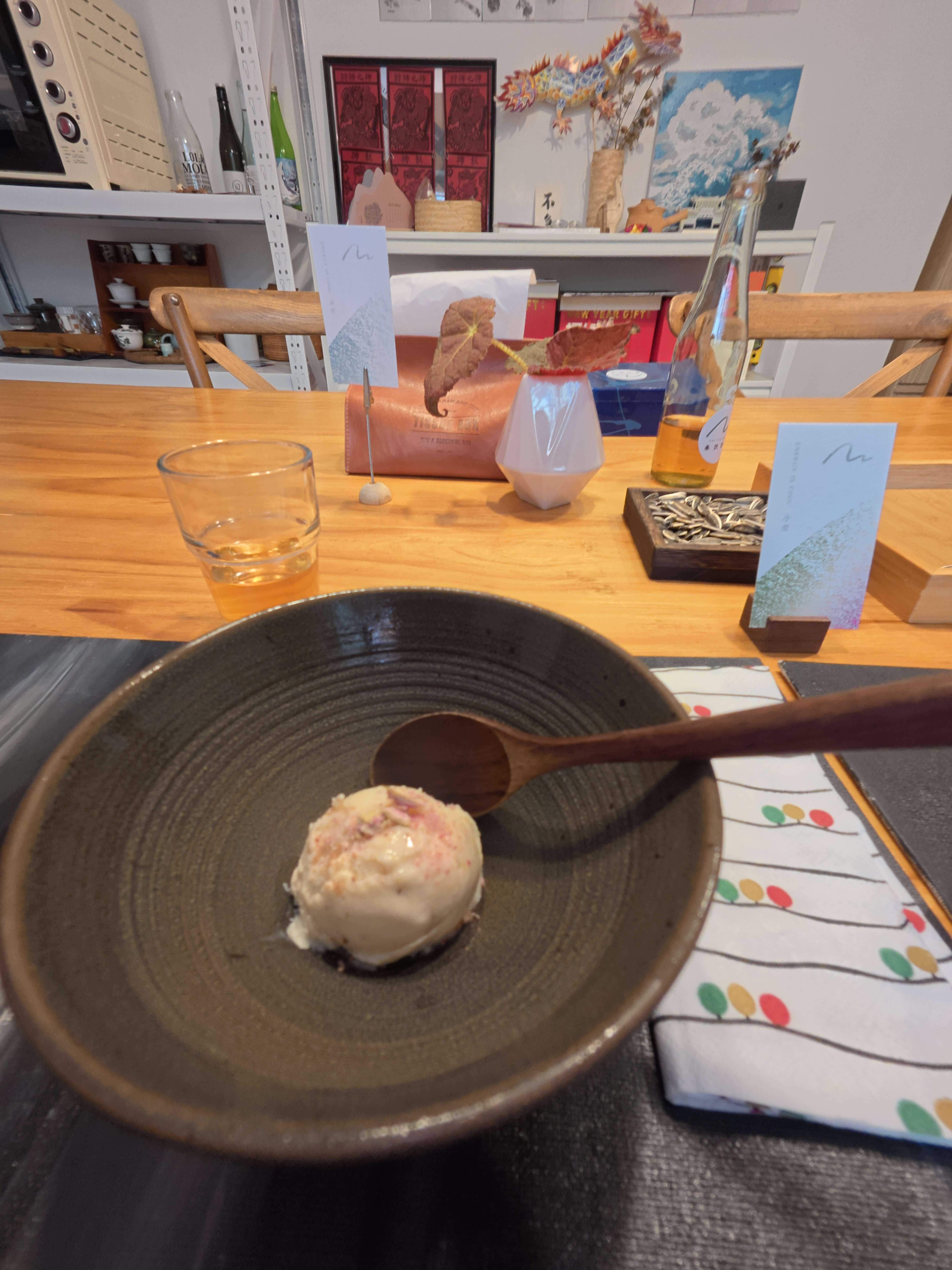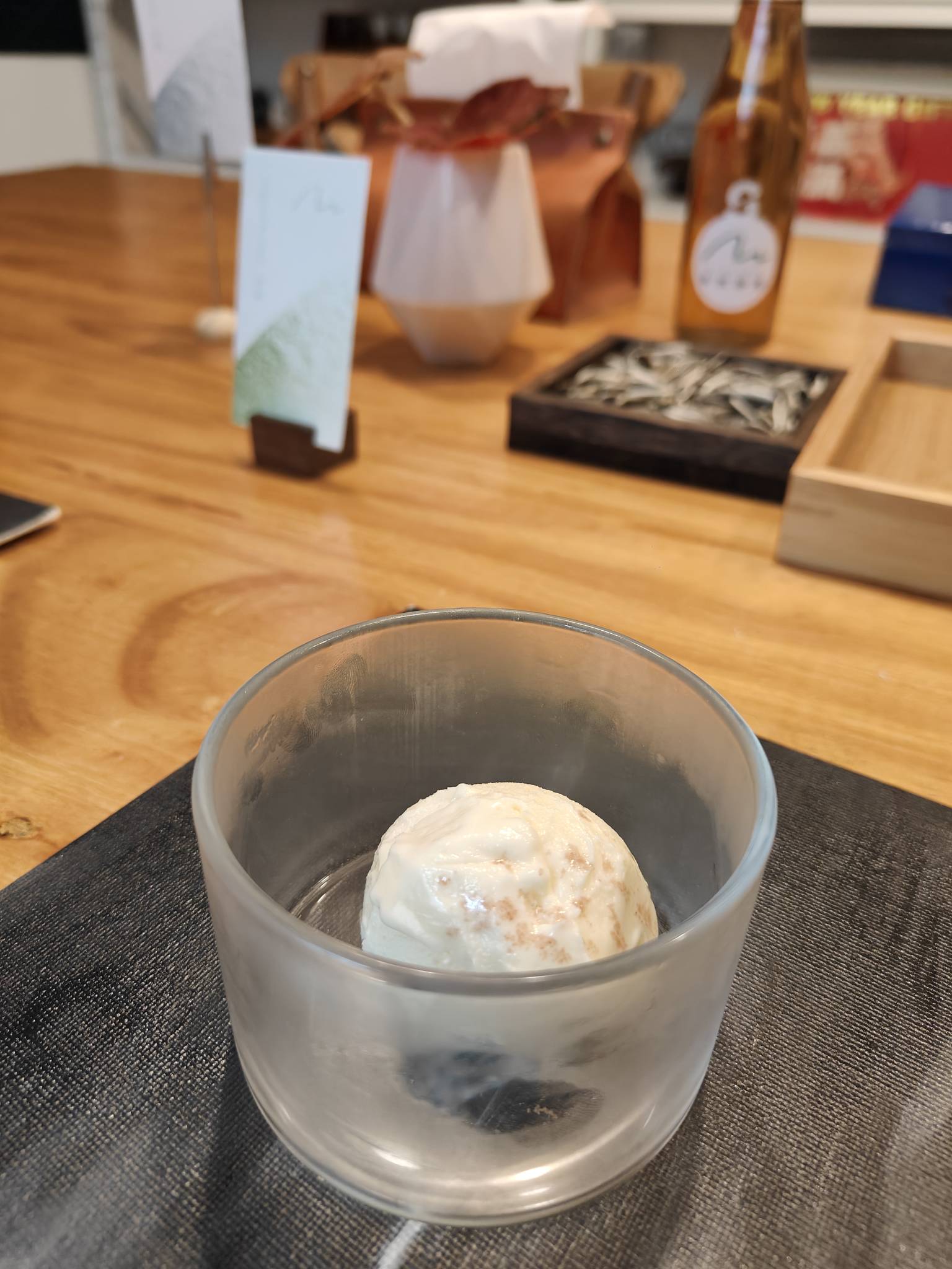 第三道“主菜”是由三款冰淇淋和抹茶司康组成的,其中也有我期待已久的干巴菌冰淇淋,我甚至激动到上菜时就不合时宜地问是否是干巴菌。这三款分别是叫“云腿”、“见手青” 和 “干巴菌”,对应的是 云南火腿、无毒见手青 (牛肝菌) 和 宜良包山干巴菌。和前面的层次感不同,这三款冰淇淋更体现在单一味道上的极致,像是极致浓郁的肉香、鲜香和清香。主理人还提醒说点缀了一些花椒来增加单一味道的层次感和平衡感。当冰淇淋略有融化时,用热乎的抹茶司康蘸上一点也是极好的。