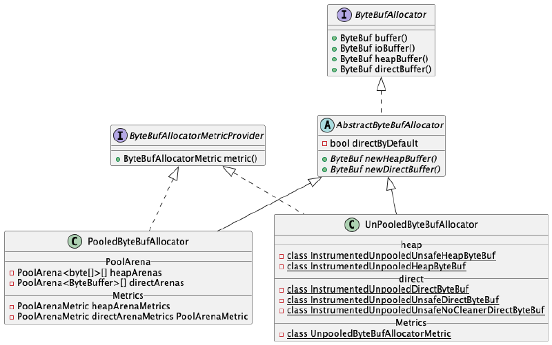 - InstrumentedUnpooledDirectByteBuf: memory is allocated using new DirectByteBuffer; memory is released by calling the NIO DirectByteBuffer cleaner implementation using reflection.