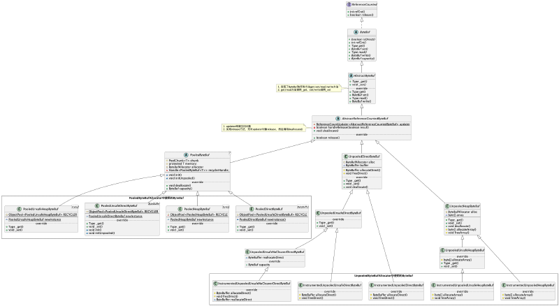 - Memory release is implemented by the PooledByteBuf class by calling the reallocate() or free() method of PoolArena.