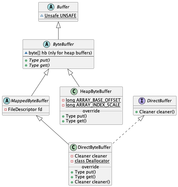 - Implements memory allocation and release in safe + cleaner mode; other cases are overridden and implemented by subclasses UnpooledUnsafeDirectByteBuf and UnpooledUnsafeNoCleanerDirectByteBuf.