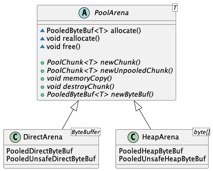 - PoolArena returns a PooledByteBuf class to the allocator, but the actual newChunk operation is performed on a generic type. This generic type is a ByteBuffer in the direct off-heap mode or a byte[] array in the heap in-heap mode.